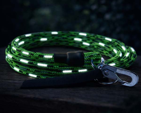 Kopplet har invävda stickningar med reflekterande tråd. När linan belyses syns reflexen tydligt, vilket ökar synligheten vid promenader i mörker.
