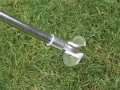 Utrustad med en hopfällbar jordplatta med spik för att förhindra att stolen sjunker ner i marken.